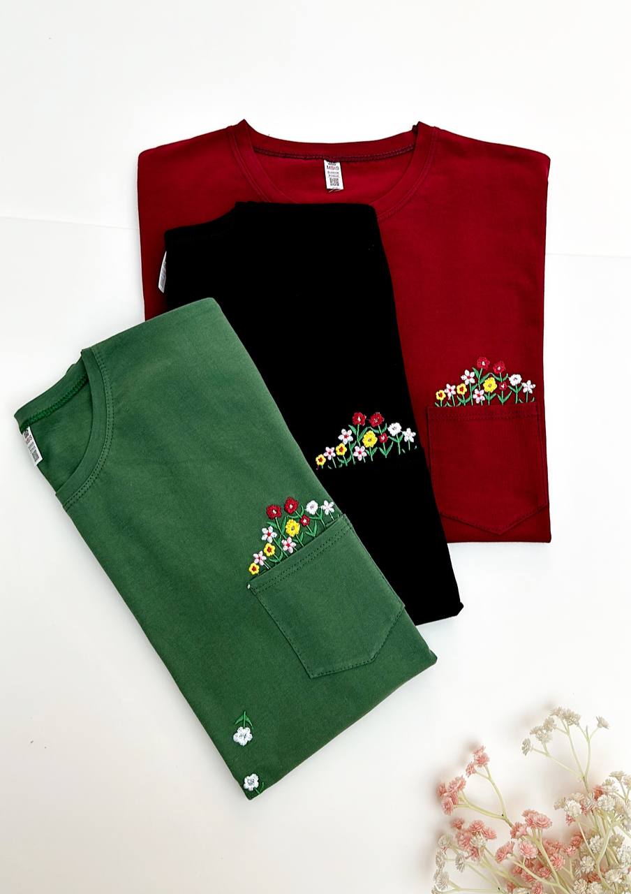 تیشرت پنبه اعلا یقه گرد ،جیب دار گلددزی شده آستین کوتاه
