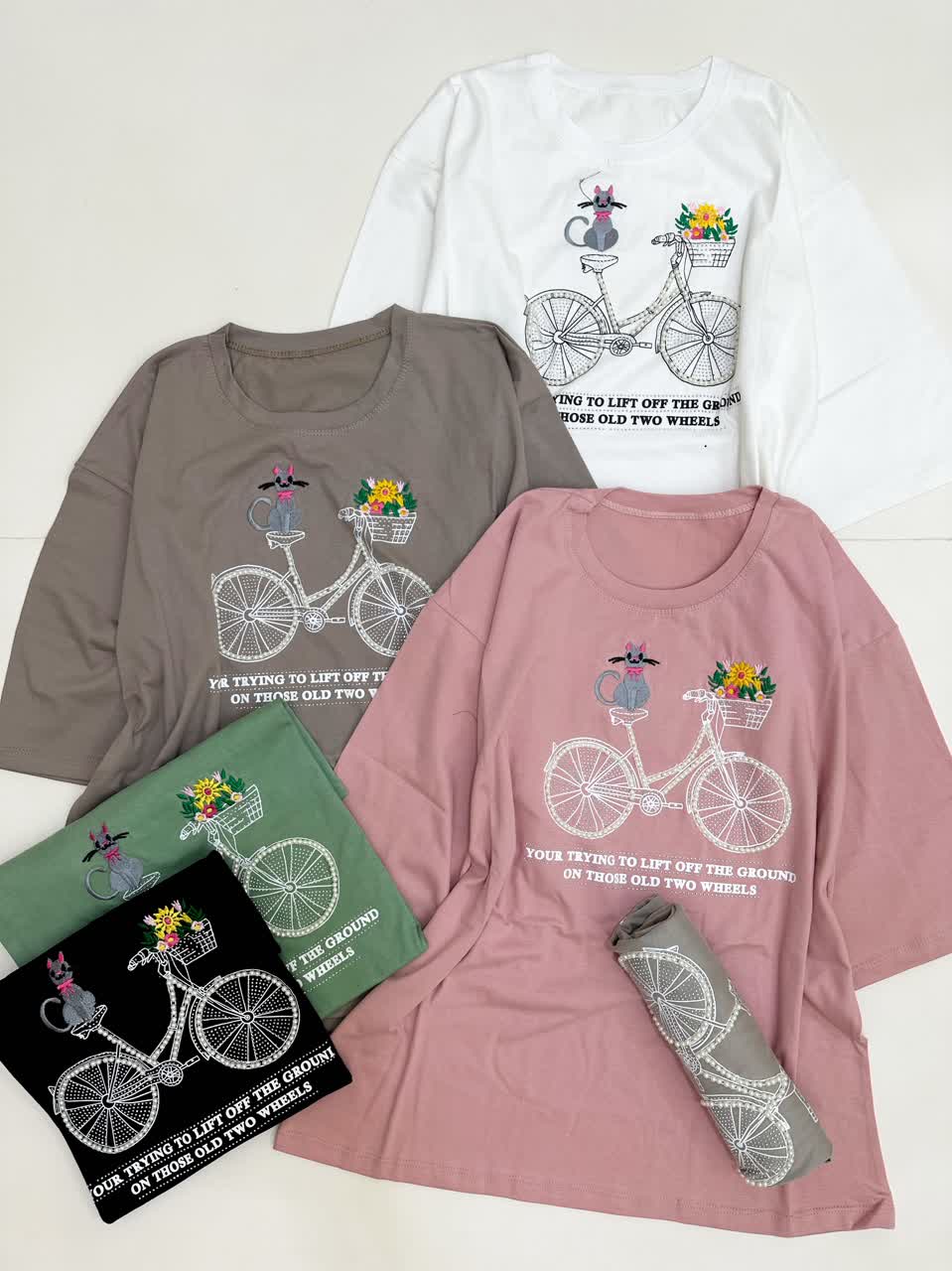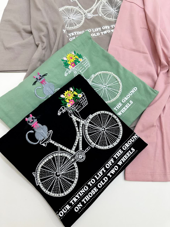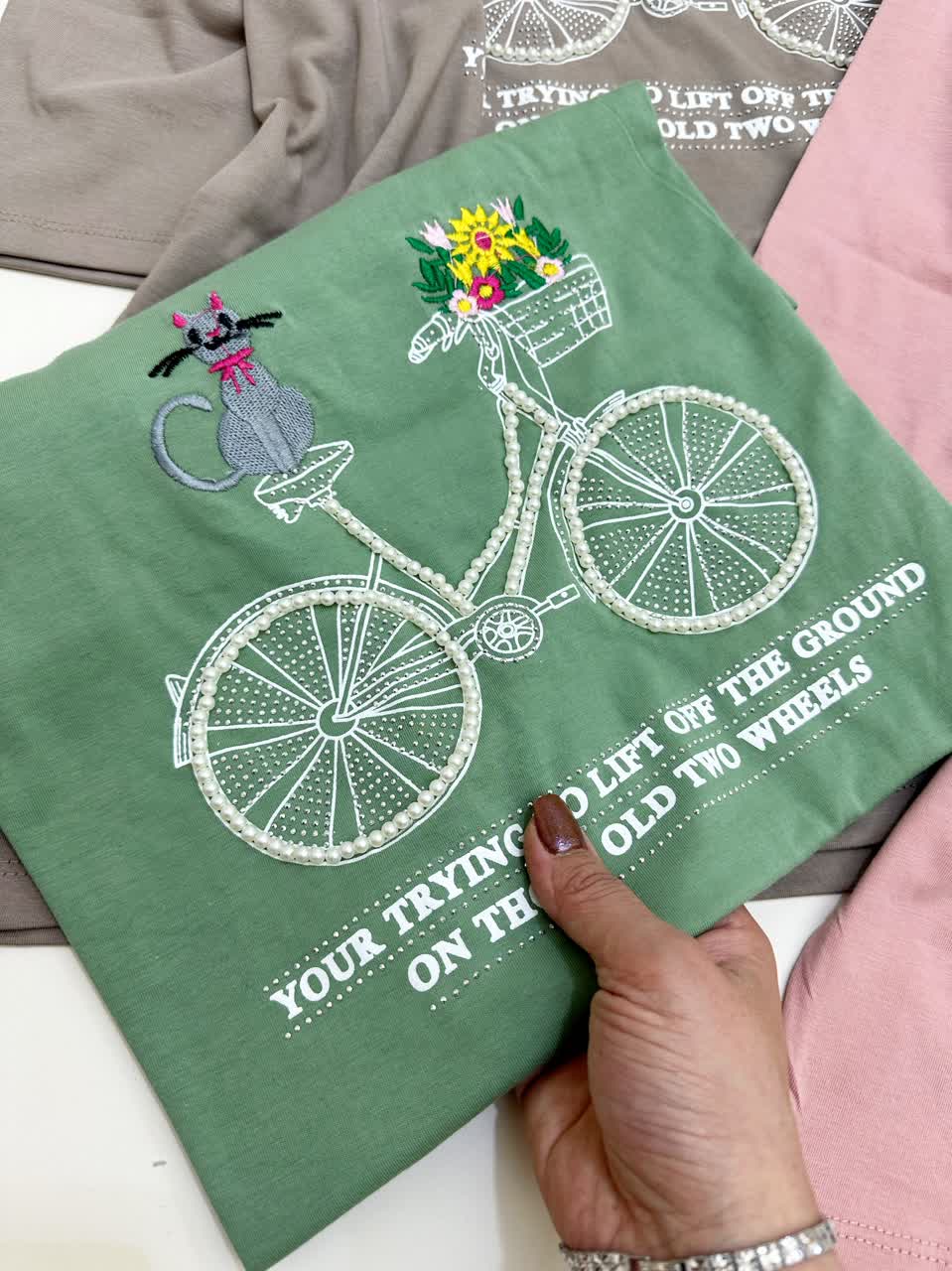 تیشرت باکسی دوچرخه،نگین و مروارید دوزی،مناسب ۳۶ تا ۴۸،در رنگبندی های زیبا و شاد،قد تیشرت ۶۰ تا ۷۰،مناسب همه سنین،جنسش نخ پنبه درجه یک ،بسیار لطیف ،مناسب برای پوست های حساس